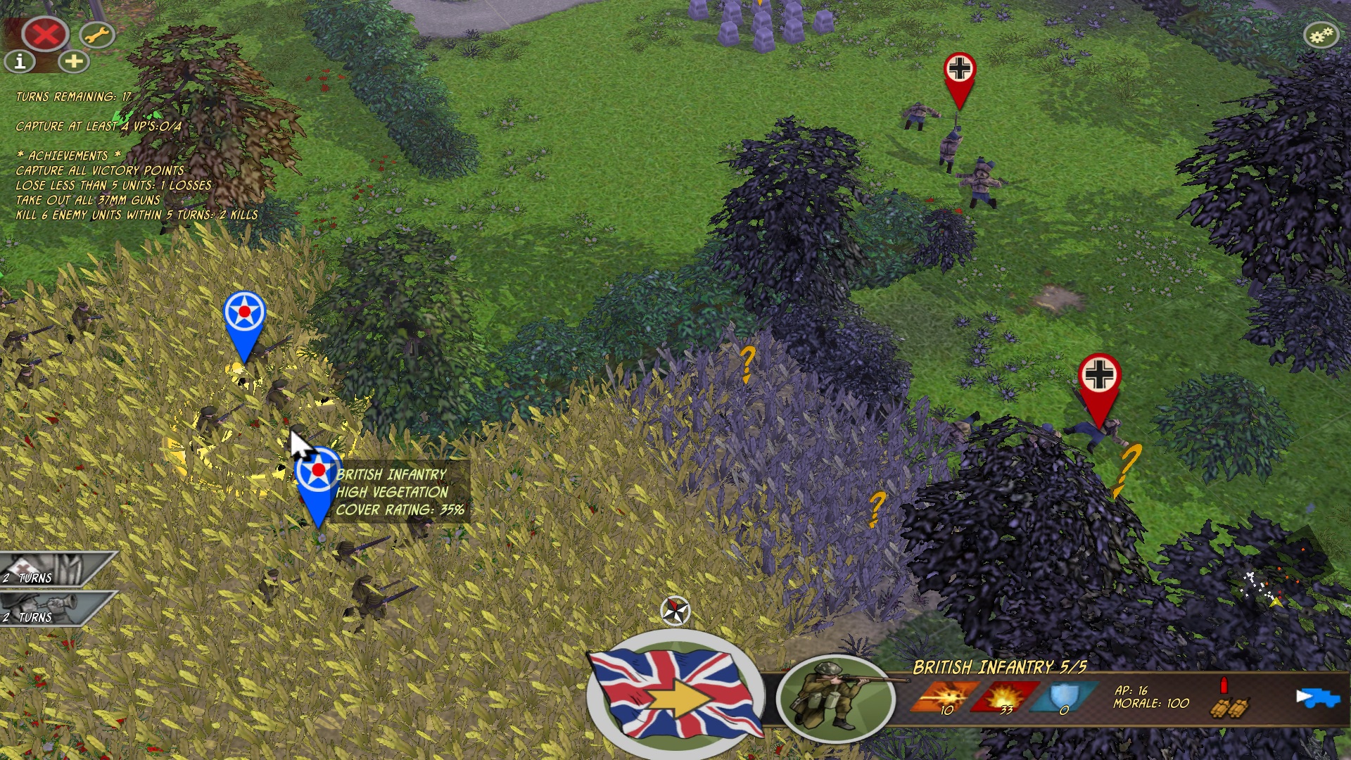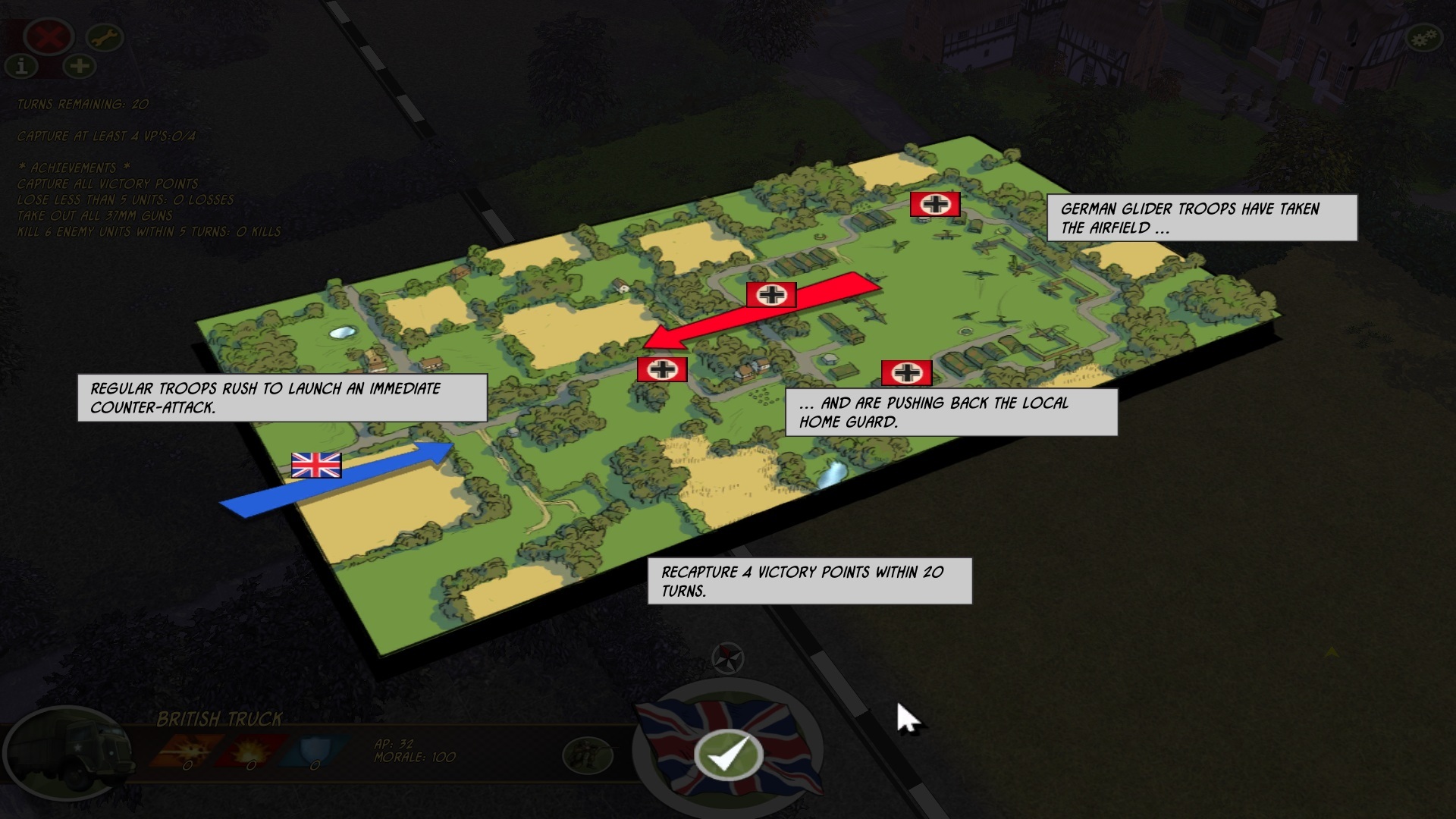 Whilst a dynamic, playable either side campaign would be ideal, I did enjoy the British “Campaign”. The maps and units are attractive, and clearly drawn. Whilst the AI isn’t too much of a challenge, even at the highest setting, the scenarios are well designed, and compensate for this. Given the time constraints for victory on the attack, the pressure is on to take ground as quickly as possible. I often ran into MG’s, and anti-tank weapons in good ambush positions. On the defence, I had to be active, since at the outset of most defence missions I found myself either heavily outnumbered, or outclassed, and good defensive tactics are the key to dealing with this.