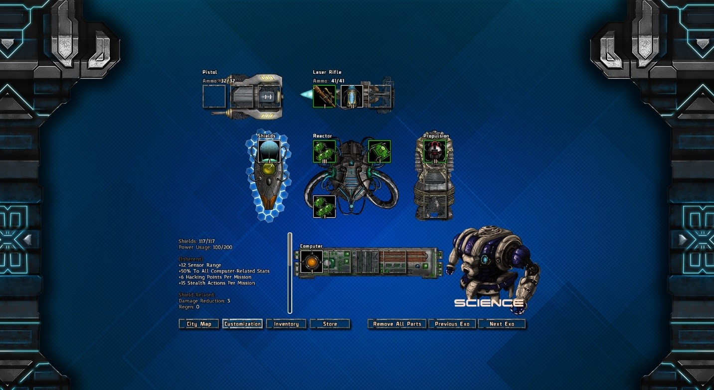 This is the inventory screen. You can see that I have highlighted one of the many types of modules that you can add to your bots. Each of these modules offers a wide variety of passive and active modifiers, improving life or shields, raising ammo levels, altering weapon damage, or providing the ability to hack or go into stealth mode. This bot is my Assault Exo, the brute of my forces. He has three weapons, a wicked laser that smokes more early level robots, a weaker machine gun with a larger ammo reserve, and a short ranged area-of-effect grenade launcher. You can switch this on the fly during the missions, and most have several slots to alter their performance.